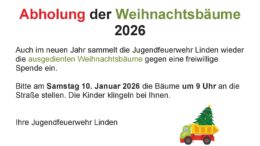 Wohin mit dem Weihnachtsbaum? Am 10. Januar 2026 ab 09.00 Uhr werden die Jugendfeuerwehren der Stadt Linden wieder die ausgedienten Weihnachtsbäume einsammeln! Bitte die (abgeschmückten) Bäume gut sichtbar spätestens um 9 Uhr vor die Häuser stellen! Wer eine kleine Spende für die Jugendlichen hinterlassen möchte, am Besten einen kleinen Zettel am Baum befestigen und die Jugendfeuerwehr macht sich kurz bei…