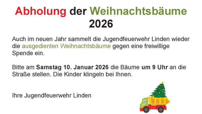 Wohin mit dem Weihnachtsbaum? Am 10. Januar 2026 ab 09.00 Uhr werden die Jugendfeuerwehren der Stadt Linden wieder die ausgedienten Weihnachtsbäume einsammeln! Bitte die (abgeschmückten) Bäume gut sichtbar spätestens um 9 Uhr vor die Häuser stellen! Wer eine kleine Spende für die Jugendlichen hinterlassen möchte, am Besten einen kleinen Zettel am Baum befestigen und die Jugendfeuerwehr macht sich kurz bei…